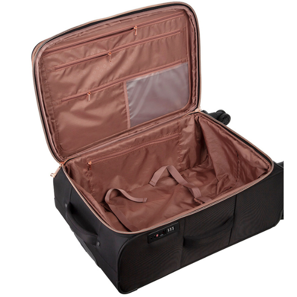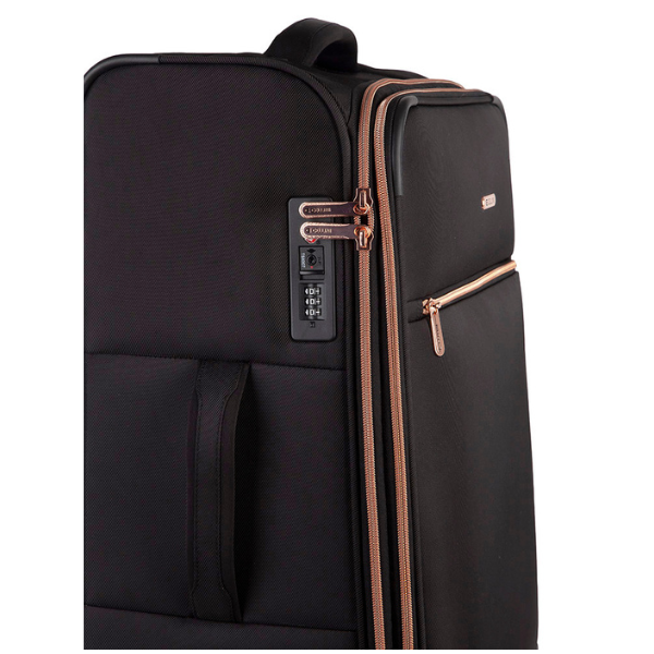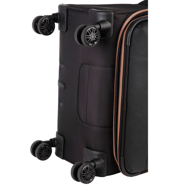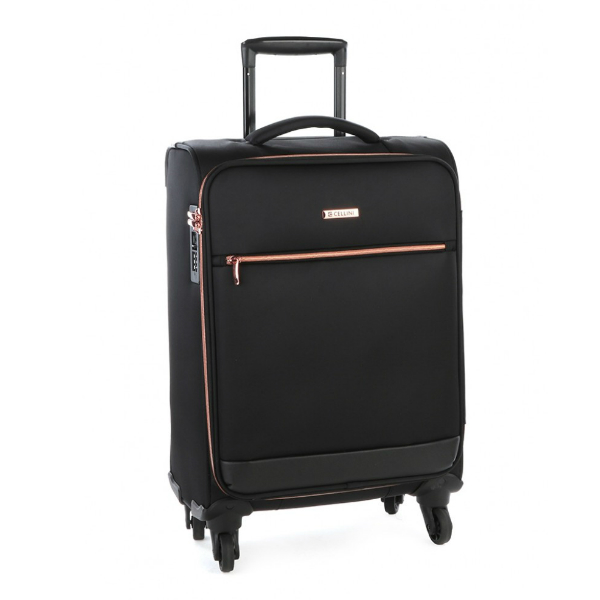 The Allure collection by Cellini is designed for the smart businesswoman who prefers to travel with style. This bag has 4 wheels, a padded grip handle for carrying-comfort and has a lockable zip. It is also light and has rose gold details. This bag is cabin-size.
